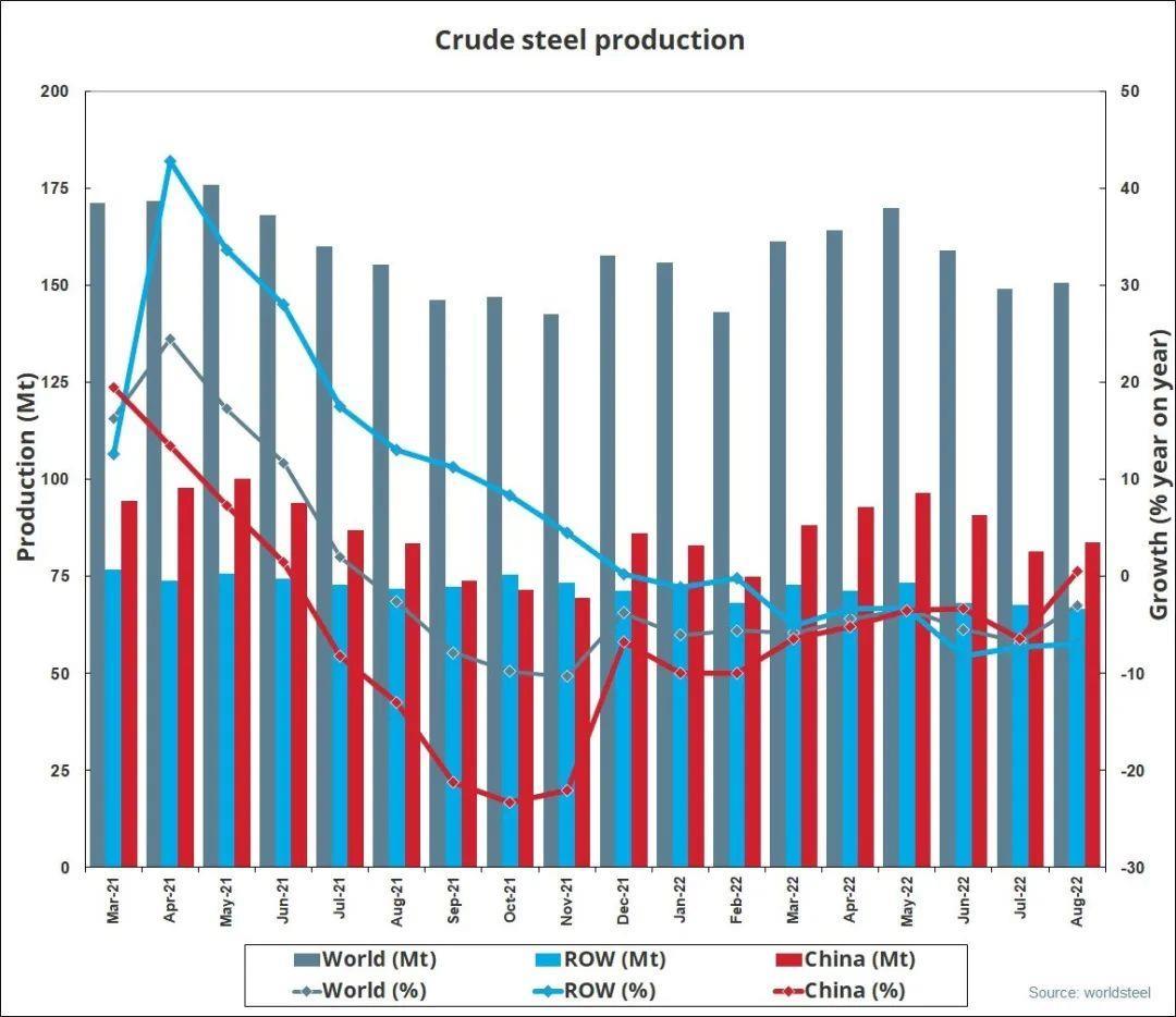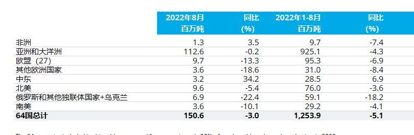 智通财经APP获悉,9月22日,世界钢铁协会发布2022年8月全球粗钢产量公告。2022年8月全球64个纳入世界钢铁协会统计国家的粗钢产量为1.506亿吨,同比下降3.0%。