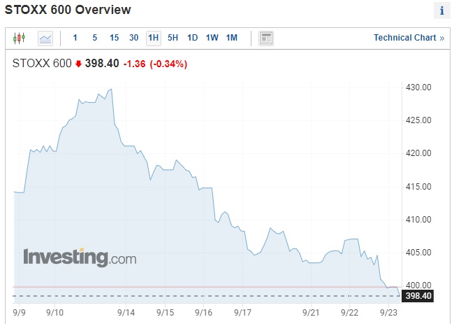 智通财经APP获悉,由于投资者担心全球各大央行持续加息将导致经济陷入衰退而纷纷逃离风险资产,欧洲股市在昨日跌至2021年1月以来的最低点后,周五继续走低。截至发稿,欧洲斯托克600指数下跌0.34%,报398.4点。其中能源和银行板块领跌,而医疗保健板块表现较佳。
