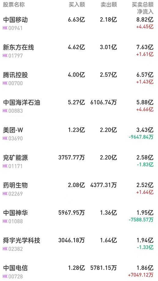 北水净买入最多的个股是中国移动(00941)、腾讯(00700)、中海油(00883)。北水净卖出最多的个股是兖矿能源(01171)、舜宇光学(02382)、中远海控(01919)。
