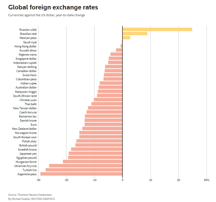 今年以来,该指数已累计下跌26%,因为激进的紧缩政策、地缘政治紧张局势和日益加剧的经济衰退担忧促使投资者转向美元等更安全的资产。