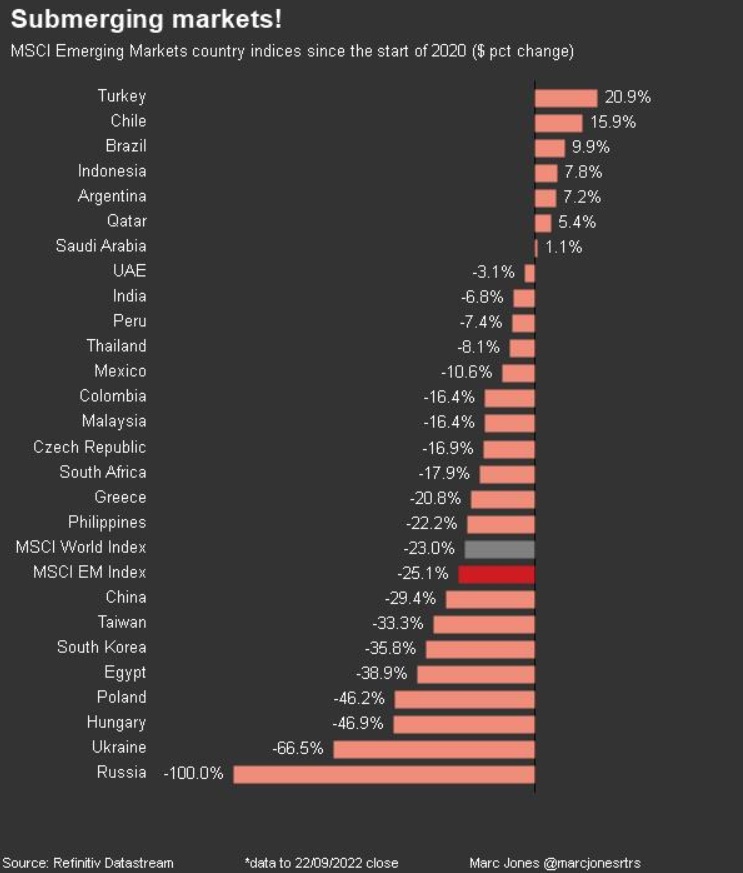 受各大央行(包括美联储本周大幅加息75个基点)政策举措影响,MSCI新兴市场指数周五下跌逾1%,连续第四周下跌。