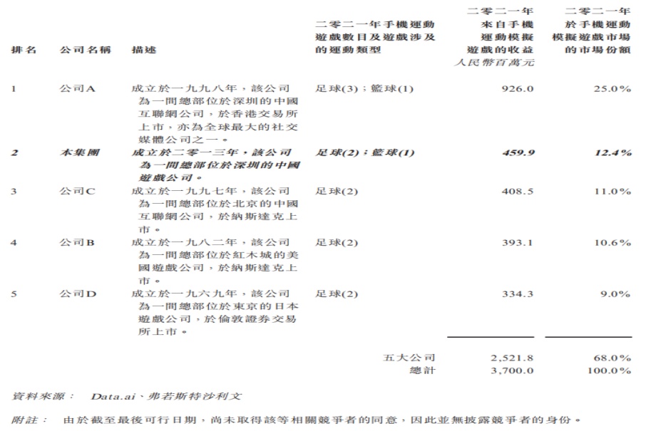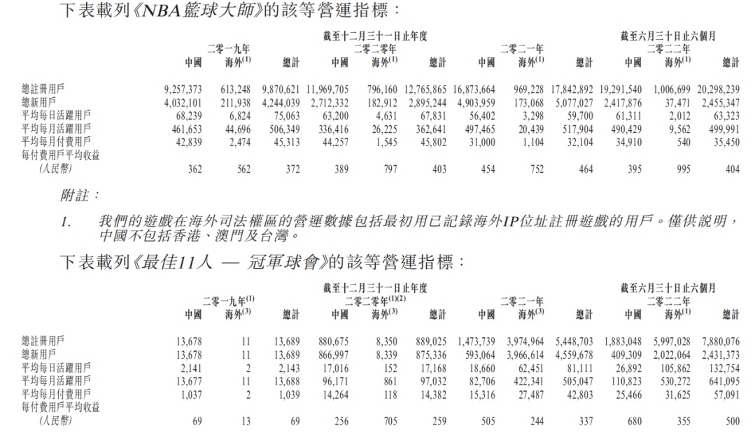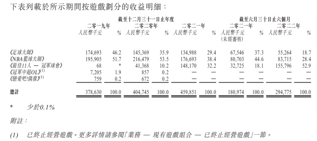 2019年至2021年,《足球大师》及《NBA篮球大师》为该公司贡献相当大部分的总收益,分别于2019年占46.2%及51.7%、2020年占35.9%及53.5%及2021年占29.4%及38.4%。《最佳11人—冠军球会》于2020年4月推出后,分别贡献2020年、2021年及截至2022年6月30日止六个月总收益的约10.2%、32.2%及52.9%。