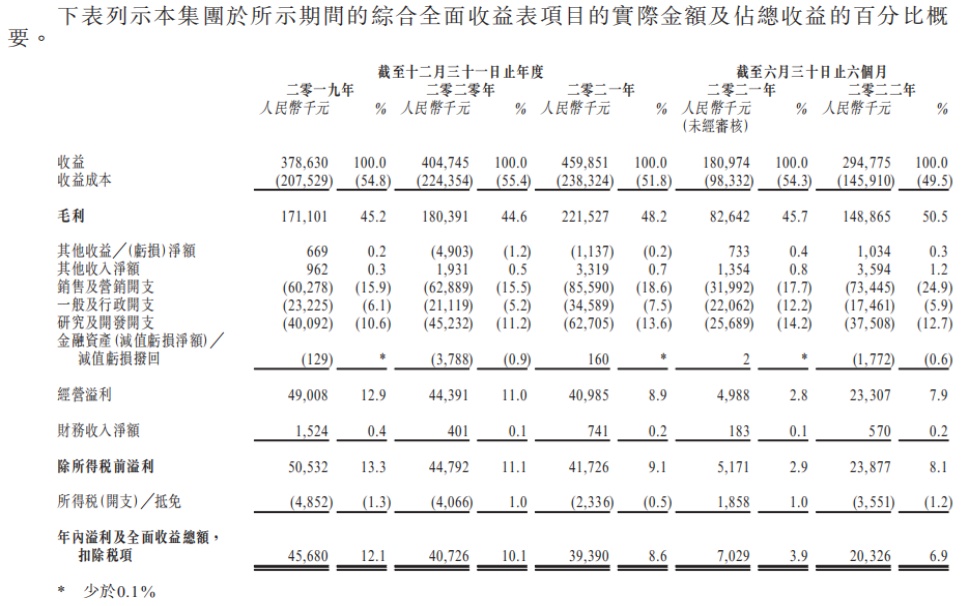 于往绩期间(截至2019-2021年止3个年度及2022年上半年),公司收益分别约3.79亿元、4.05亿元、4.6亿元及2.95亿元;毛利率分别为45.2%、44.6%、48.2%及50.5%;净利润分别为4568万元、4072.6万元、3939万元及2032.6万元。
