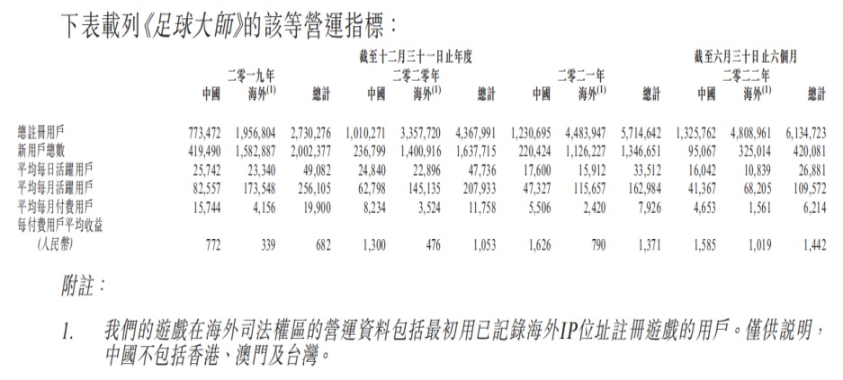 作为公司早期的王牌手游之一,《足球大师》2022年上半年的平均月付费用户仅为6214名,远低于2019年的19,900名。