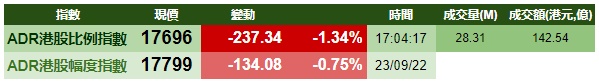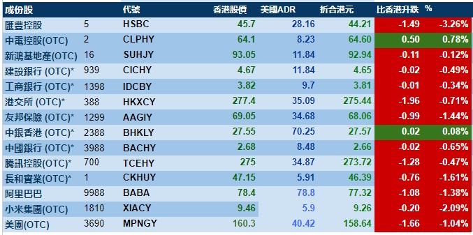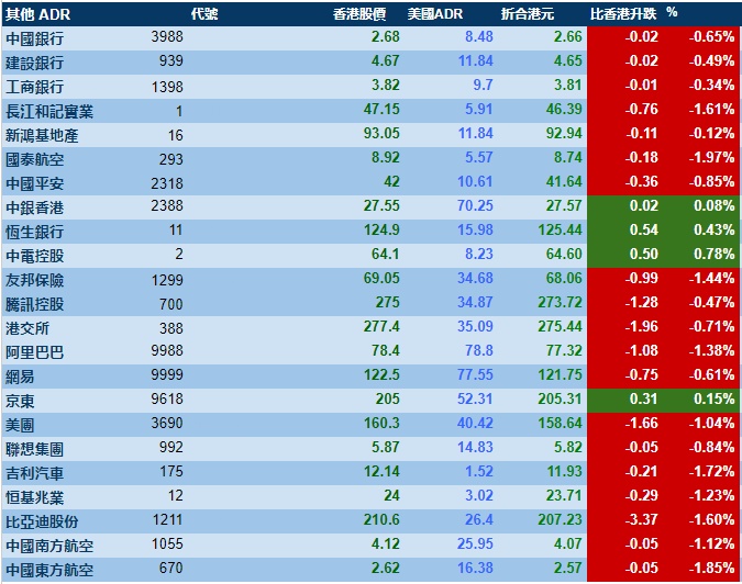 智通财经APP获悉,周五美股三大指数集体收跌,港股ADR指数下跌,按比例计算,收报17696点,较香港收市跌237.34点或1.34%。