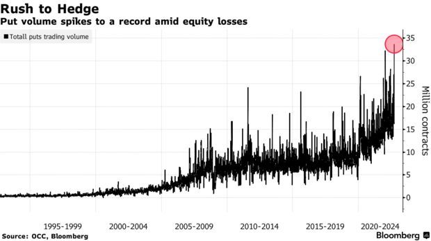 智通财经APP获悉,受到美股震荡惊吓的期权交易员以有记录以来最快速度抢购股票看跌期权。