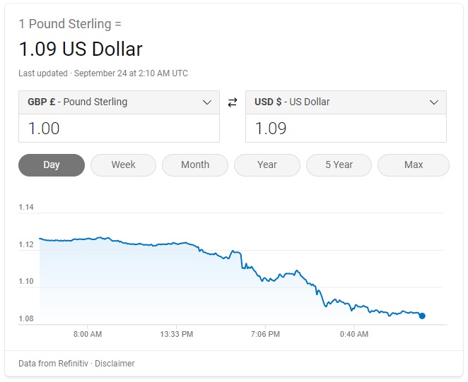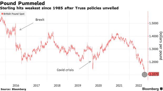 市场对此项减税方案的反应直接表现为英镑大跌。周五,英镑兑美元汇率自1985年以来首次跌穿1.10,日内跌超3%,创两年半来最大跌幅;截至发稿,英镑兑美元汇率已跌至1.09。