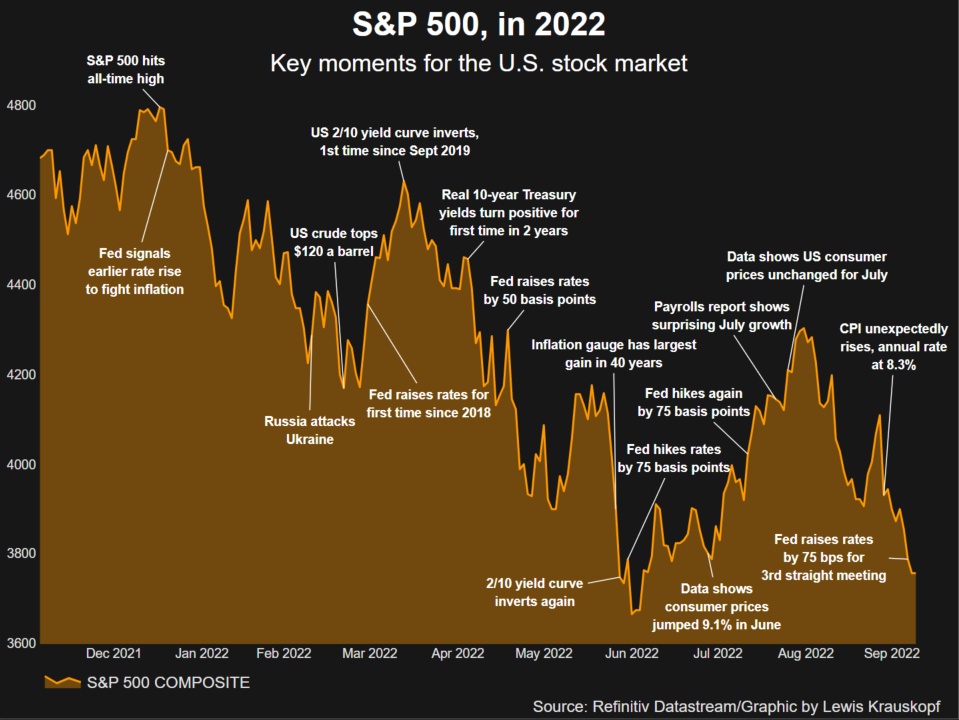 数据显示,标普500指数今年以来下跌了22%以上。周五,标普500指数一度跌破6月中旬的收盘低点3666点,该指数在今年夏季的强劲涨幅已被悉数抹去。尽管近期数据显示美国经济相对强劲,但投资者担心美联储的紧缩政策将导致经济低迷。