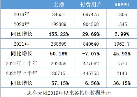 至2022年上半年,思享无限的颓势越发明显,主播端、付费用户端均同比下滑,其中主播数量大跌57.15%至8.67万,付费用户同比降6.56%至44.58万。报告期内收入增长27.9%至9.7亿元完全是由每付费用户的平均支出提升36.15%至2143元所带动。