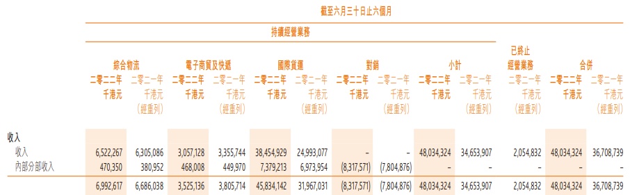 同期,嘉里物流的综合物流、电子商贸及快递业务分别实现收入65.22亿港元、30.57亿港元,占比13.6%、6.4%,规模增长了3.4%、-8.9%。