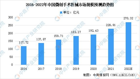 数据表明,中国微创外科手术器械及配件市场的规模由2016年的117.72亿元增至2020年的192.43亿元,复合年增长率为13.1%,预计2022年将达至270.32亿元。