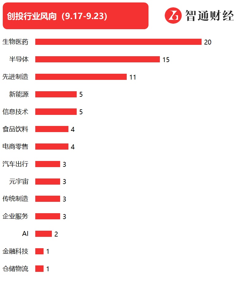 据智通财经统计,本周创投事件合计80起,环比上周增加67%。从赛道上看,生物医药、半导体、先进制造热度领先,融资项目分别达20个、15个、11个。从融资轮次上看,周内A/A+轮、B/B+轮融资项目数量最多,均达17个。