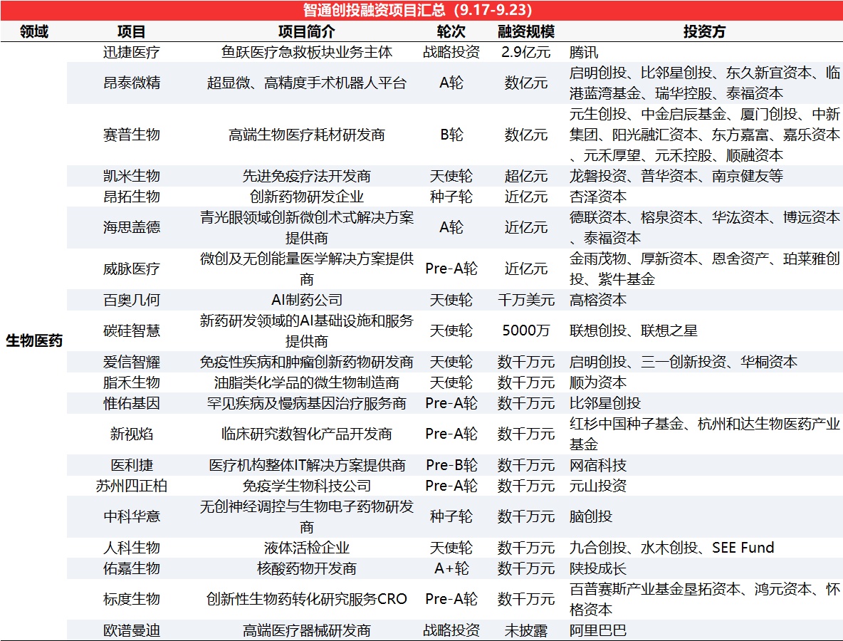 大健康领域,7个项目完成亿元级融资。本周,鱼跃医疗急救板块业务主体迅捷医疗、超显微及高精度手术机器人平台昂泰微精、高端生物医疗耗材研发商赛普生物等7家企业完成亿元级融资。另外,AI制药公司百奥几何、新药研发领域的AI基础设施和服务提供商碳硅智慧、免疫性疾病和肿瘤创新药物研发商爱信智耀等12家公司获数千万元融资。