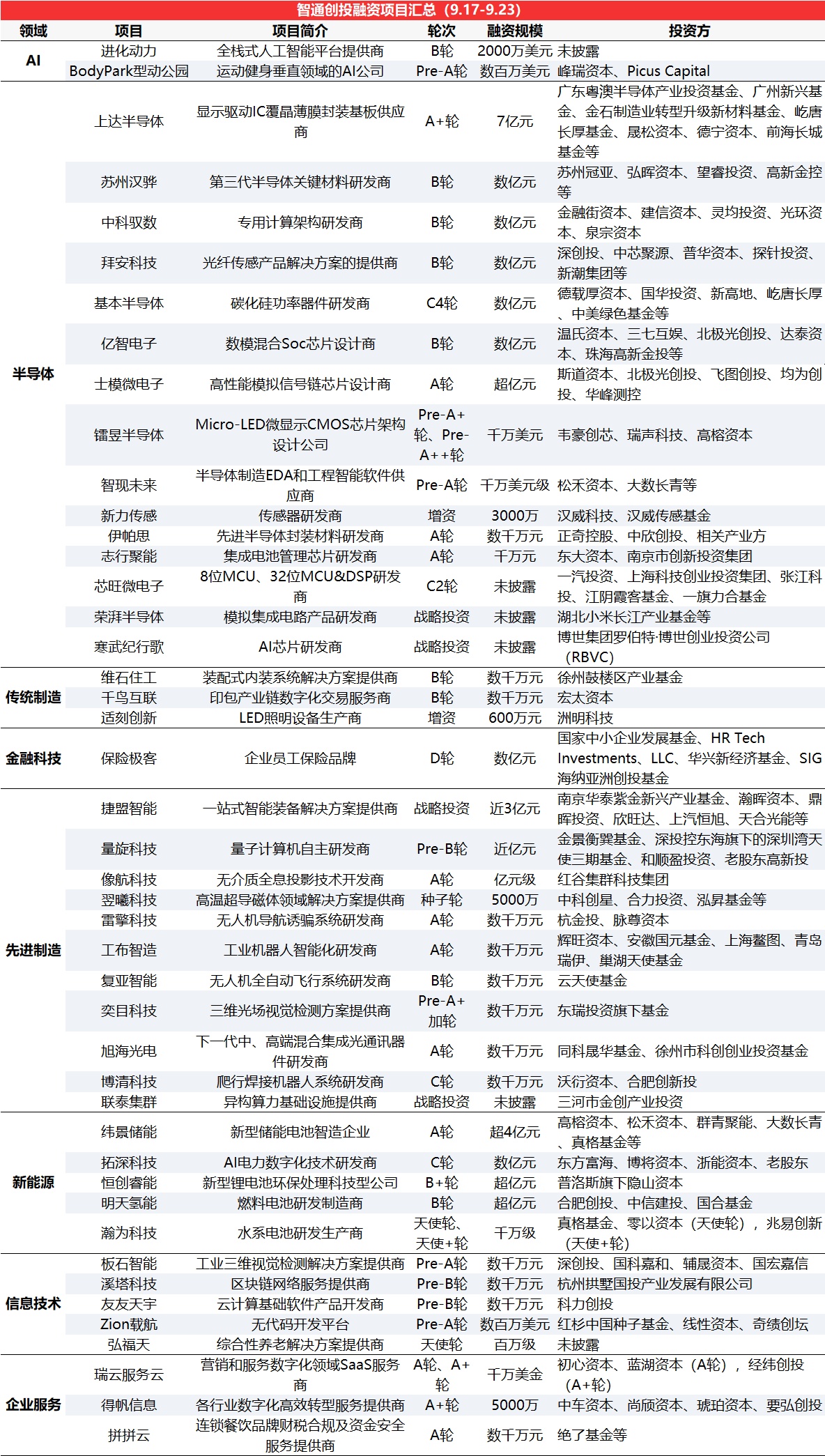 科创领域,半导体、先进制造赛道融资事件较多。半导体领域,显示驱动IC覆晶薄膜封装基板供应商上达半导体、第三代半导体关键材料研发商苏州汉骅、专用计算架构研发商中科驭数等7家公司获亿元以上融资。先进制造领域,一站式智能装备解决方案提供商捷盟智能、量子计算机自主研发商量旋科技、无介质全息投影技术开发商像航科技完成亿元级融资。