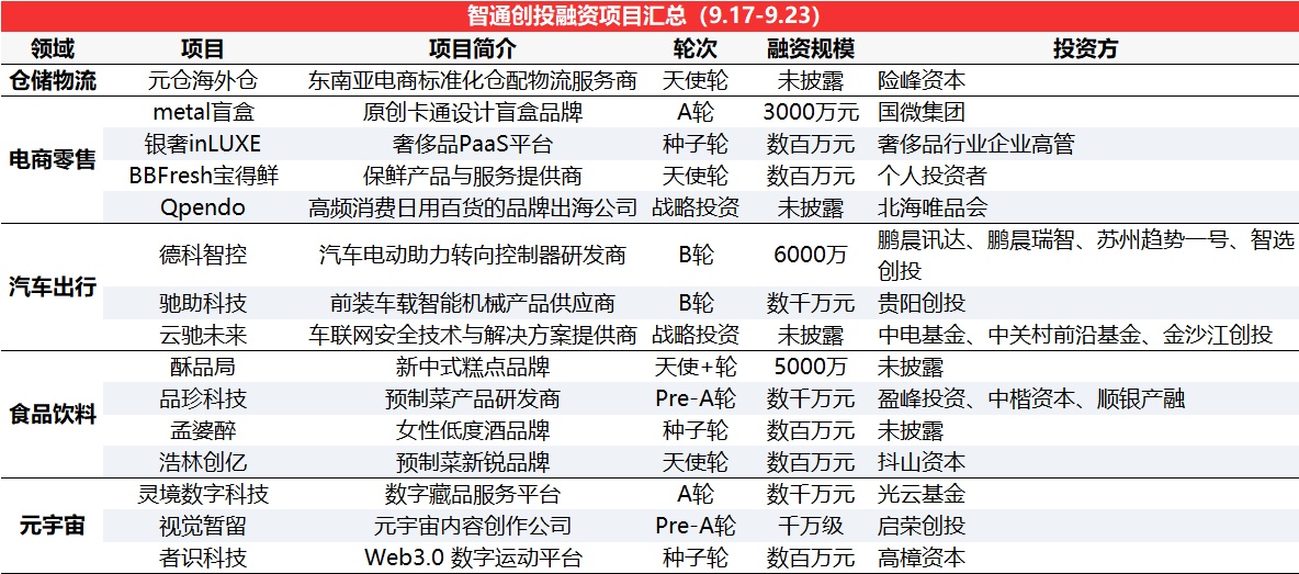 泛消费领域,电商零售、食品饮料赛道热度有所提升。原创卡通设计盲盒品牌metal盲盒获3000万元融资,新中式糕点品牌酥品局、预制菜产品研发商品珍科技获数千万元融资。汽车出行赛道,汽车电动助力转向控制器研发商德科智控、前装车载智能机械产品供应商驰助科技获数千万元融资。
