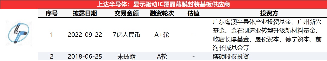 据公开资料显示,上达半导体成立于2017年6月,是一家显示驱动IC覆晶薄膜封装基板供应商,专注于从事高精密超薄柔性封装基板、大规模集成电路、电子元件的研发、生产、销售及技术咨询、技术服务、卷带式柔性IC载板连接芯片、半导体材料及元器件的封装及测试等业务。
