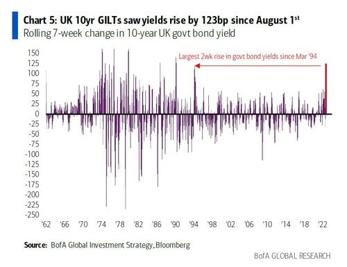 自8月1日以来,美国10年期国债收益率上涨110个基点,英国10年期国债收益率为上涨123个基点(1994年以来最快),德国10年期国债收益率上涨87个基点(1990年以来最快),法国10年期OATs债券收益率上涨83个基点(1994年以来最快)。