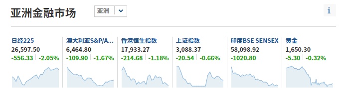 数据显示,周一,亚太市场开盘下挫,日经225指数低开1.4%,报26779.44点,现跌超2%;东证指数低开1.3%,报1892.16点;韩国首尔综指低开1.3%。