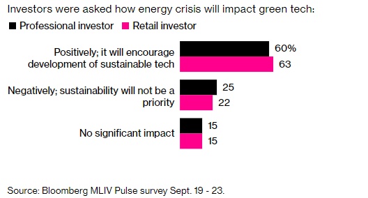 投资者观察到高额电费和燃料稀缺推动了绿色解决方案的发展。零售业者最为乐观,63%的受访者表示,他们认为油气危机将鼓励可持续电子产品的发展。