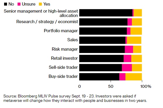 与此同时,散户和专业投资者也看空元宇宙。超过70%的MLIV Pulse受访者表示,他们知道元宇宙是什么,但它在未来两年不会改变人与人、人与企业的互动方式。这种观点与扎克伯格对元宇宙潜力的极力吹捧显得十分尴尬。