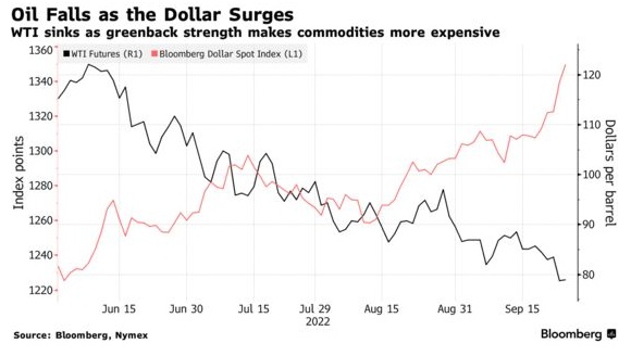 原油价格将出现两年多来的首次季度下跌,因包括美联储在内的多家央行大举加息,损害了能源需求前景,削弱了投资者的风险偏好。美联储的紧缩政策推动美元汇率升至创纪录水平,使得以美元计价的大宗商品对海外买家来说更加昂贵。