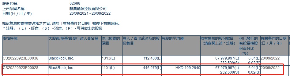 智通财经APP获悉,香港联交所最新资料显示,9月20日,贝莱德增持新奥能源(02688)44.6979万股,每股作价109.2640港元,总金额约为4883.87万港元。增持后最新持股数目约为6798.00万股,最新持股比例为6.01%。