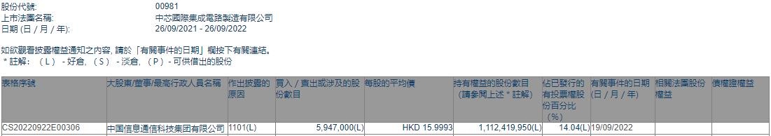 智通财经APP获悉,香港联交所最新资料显示,9月19日,中国信息通信科技集团有限公司增持中芯国际(00981)594.7万股,每股作价15.9993港元,总金额约为9514.78万港元。增持后最新持股数目约为11.12亿股,最新持股比例为14.04%。