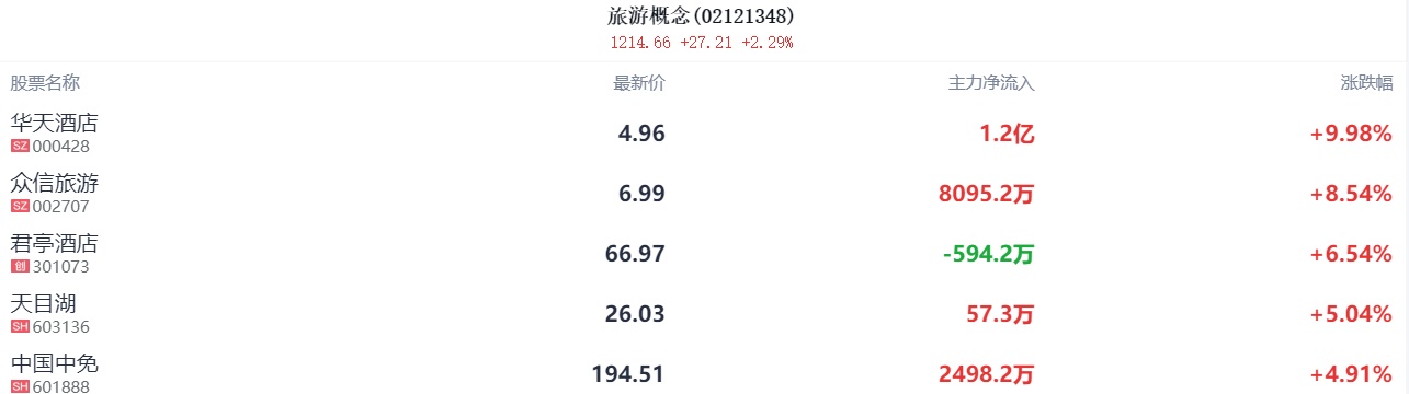 旅游板块快速拉升,华天酒店、众信旅游涨停,君亭酒店涨近8%,同庆楼、中国中免、西域旅游等跟涨。