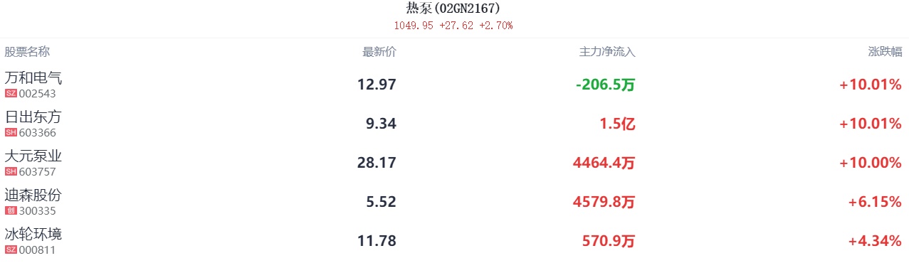 热泵概念股大幅走高,日出东方涨停,申菱环境、大元泵业、迪森股份涨超5%,长虹美菱、三花智控、幸福泵业、冰山冷热、创元科技、冰轮环境等跟涨。