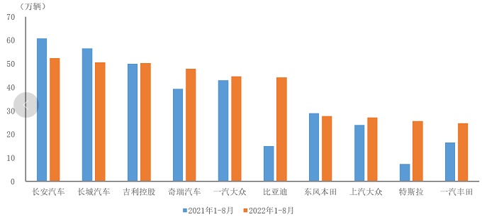智通财经APP获悉,9月26日,据中国汽车工业协会统计分析,2022年1-8月,销量排名前十位的SUV生产企业共销售395.2万辆,占SUV销售总量的57%。在销量排名前十位的SUV生产企业中,与上年同期相比,长安汽车(000625.SZ)、长城汽车(02333)、东风本田销量有所下降,其他企业均呈增长,其中比亚迪(002594.SZ)、特斯拉(TSLA.US)增速更为显著。