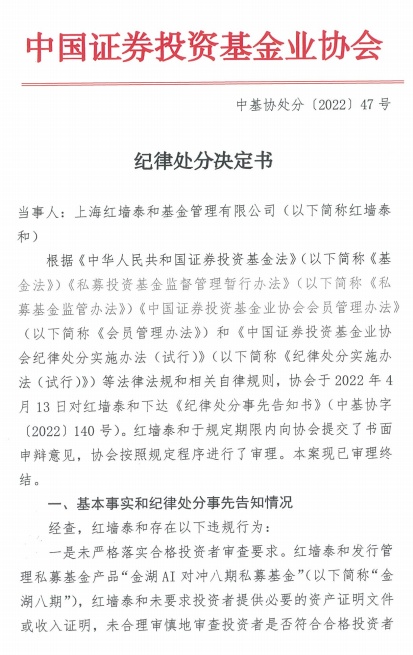 处分决定书显示,上海红墙泰和基金主要存在三项违规行为,分别是未严格落实合格投资者审查要求、内控制度不健全、未按要求配合协会自律管理等。