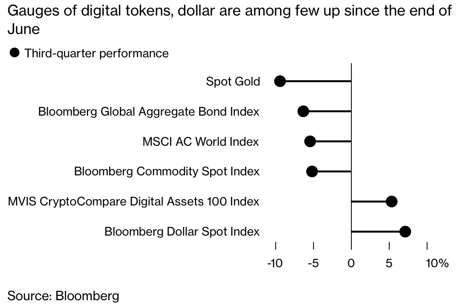 在市场的剧烈波动之下,加密货币有望与美元争夺第三季度表现最佳资产的头衔。在全球各大央行为抗击通胀而大举收紧货币政策的情况下,更具吸引力的利率和避险需求推动美元走高。向来波动较大的加密货币为何能在第三季度顶住更广泛的抛售是一个悬而未决的问题,一个可能的因素是以太坊合并升级带来的乐观情绪推动该加密货币上涨27%。