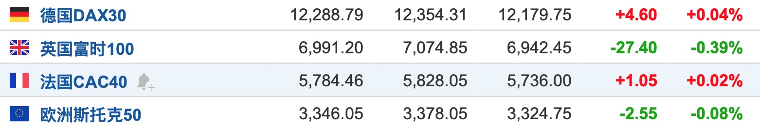 2. 截至发稿,德国DAX指数涨0.04%,英国富时100指数跌0.39%,法国CAC40指数涨0.02%,欧洲斯托克50指数跌0.08%。