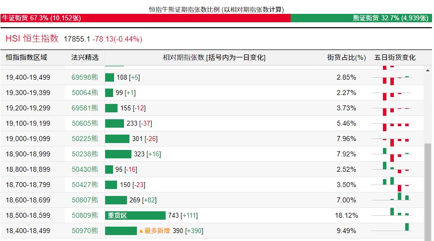 法兴恒指牛熊证街货分布图中的数据显示,熊证街货重货区在18500-18599区间,该区间最新熊证数量为743张,较上一交易日增加111张;最多新增在18400-18499区间,该区间最新牛证数量为390张,较上一交易日增加390张。