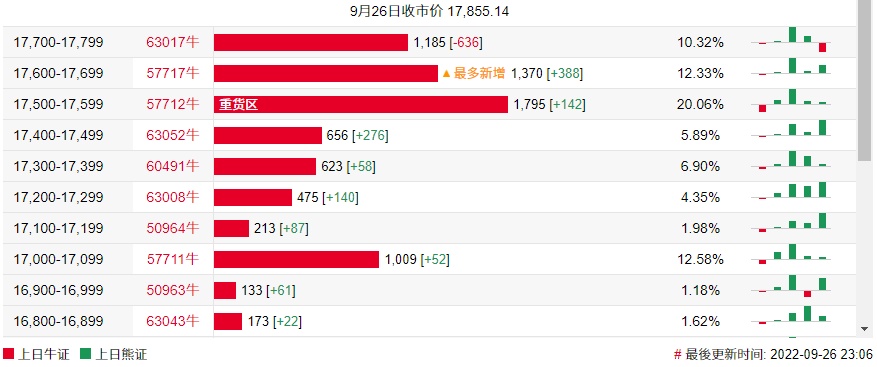 牛证街货重货区在17500-17599区间,该区间最新牛证数量为1795张,较上一交易日增加142张;最多新增在17600-17699区间,该区间最新牛证数量为1370张,较上一交易日增加388张。
