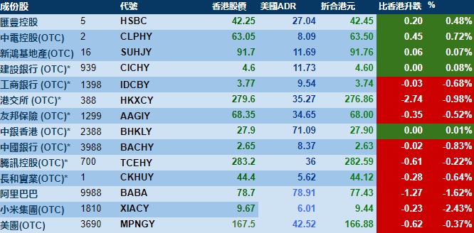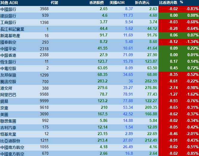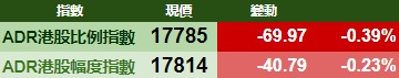 智通财经APP获悉,周一美股三大指数集体收跌,港股ADR指数下跌,按比例计算,收报17785点,较香港收市跌69.97点或0.39%。