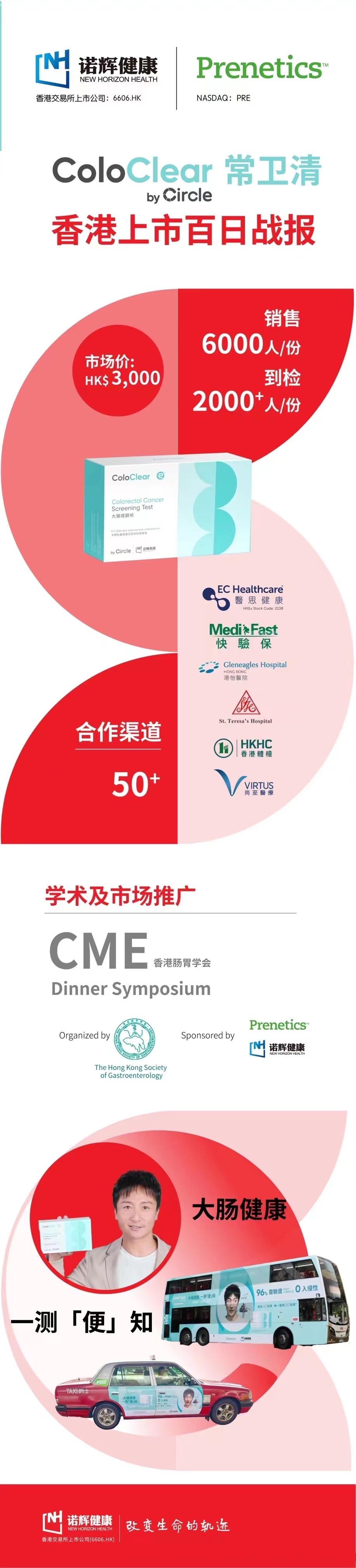 诺辉健康与Prenetics今年5月23日达成深度战略合作,推动“中国癌症早筛第一证”产品常卫清在中国香港上市,未来计划覆盖中国澳门、中国台湾,并同期探索“出海”东南亚。常卫清是Prenetics在以上区域独家合作的结直肠癌早筛产品,今年6月份首发香港市场,并启动全面户外及线上广告宣传。