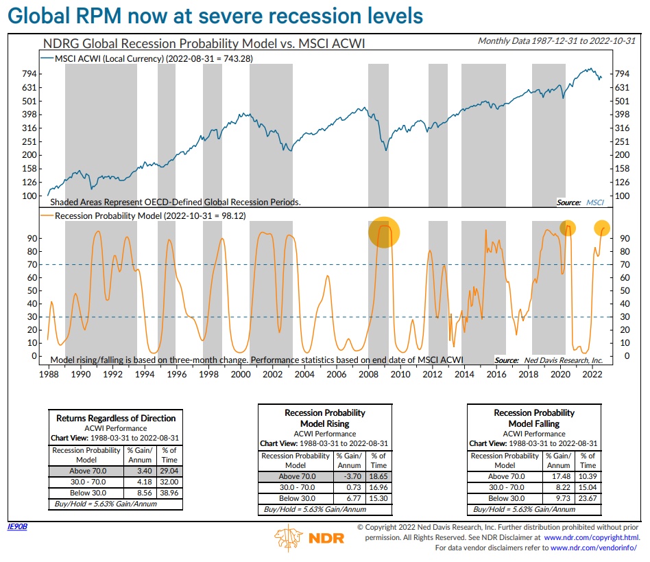 Ned Davis Research统计全球衰退概率的模型显示最新数据上升到98%以上,触发了严重衰退信号。来自该机构的分析师Alejandra Grindal和Patrick Ayres表示,该模型仅有的其他几次类似如此高的数据是在此前严重衰退期间,比如2020年和2008-2009年。他们在一份报告中写道:“这表明,在2023年的一段时间内,全球严重衰退风险正在上升,这将给全球股市带来进一步下行风险。”