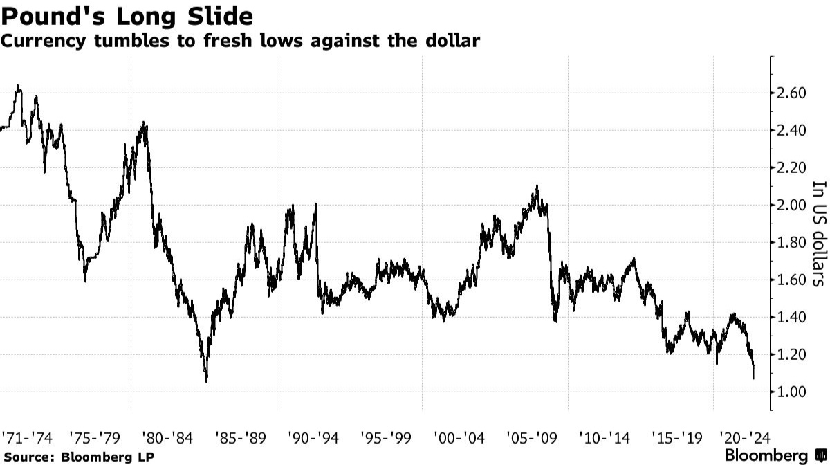 英镑兑美元周一跌至1.035美元的纪录低点,截至发稿,英镑兑美元汇率涨0.79%,报1.077。此前在2021年年中,英镑汇率约为1.4美元,2008年为2美元。值得一提的是,上一次英镑汇率接近1美元是在1985年,当时世界主要大国还没有协调一致压低美元的价值。