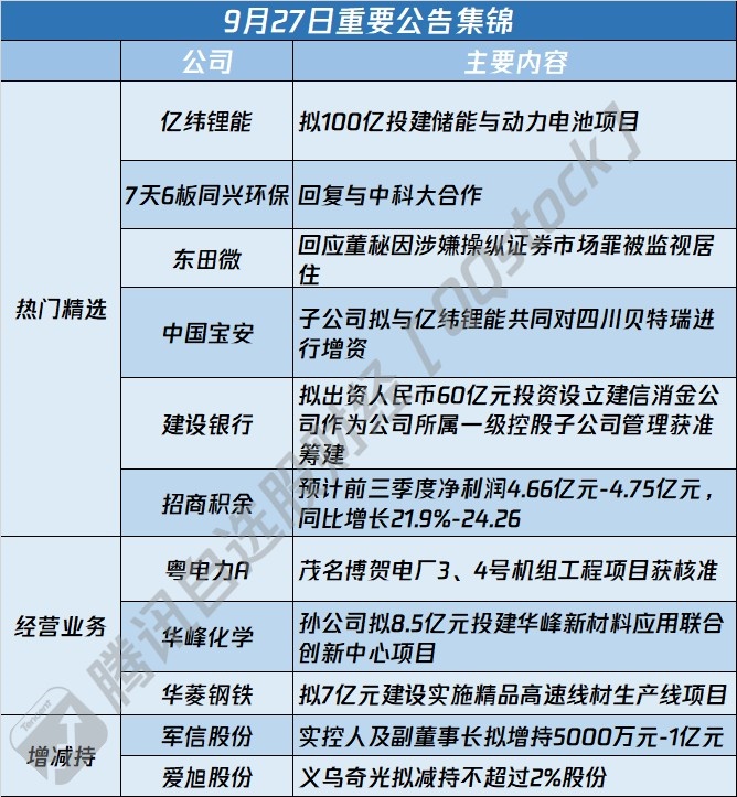 今日晚间《公告精选》的主要内容有:①亿纬锂能拟100亿投建储能与动力电池项目;②7天6板同兴环保回复与中科大合作;③东田微回应董秘因涉嫌操纵证券市场罪被监视居住;④中国宝安子公司拟与亿纬锂能共同对四川贝特瑞进行增资。