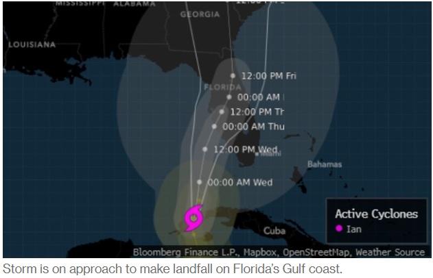 美国国家飓风中心表示,预计在未来12到24小时内,伊恩的风速仍将达到130英里/小时的峰值,按照萨菲尔-辛普森五级标准,伊恩将成为4级风暴。预计将于周三晚些时候登陆。