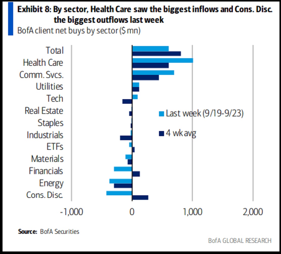 美国银行表示,过去一周资金大量流入的其他板块包括通信服务、技术和公用事业。相比之下,其客户从可选消费品、能源和金融等七个板块撤回了资金。