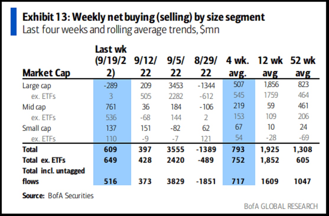 与此同时,该银行客户连续第三周买入中盘股,并连续第二周买入小盘股。他们的资金从大盘股净流出,为三周来首次出现这种情况。