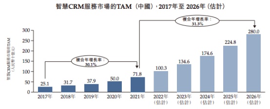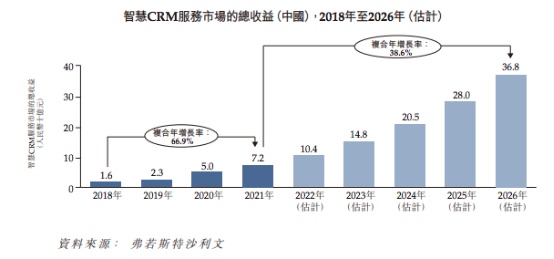 在这样的背景下,中国智慧CRM市场持续壮大。据弗若斯特沙利文数据显示,2021年时,我国智慧CRM服务市场的总收益为72亿元,至2026年时,市场收益有望提升至368亿元,5年复合年增长率达38.6%。