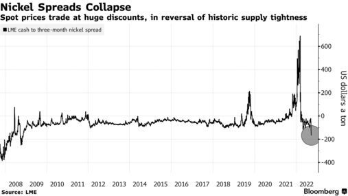 智通财经APP获悉,近期,美元上行和利率上升使银行为伦敦金属交易所(LME)头寸融资的成本大幅提高,尤其是对于欧洲银行。几位交易员表示,镍是LME交易活跃的价格最高的金属,美元和利率的走势令这些银行急于抛售持有成本越来越高的头寸。镍的现货合约周一相对3个月远期合约出现了2008年金融危机以来的最大贴水,达到负167美元/吨。