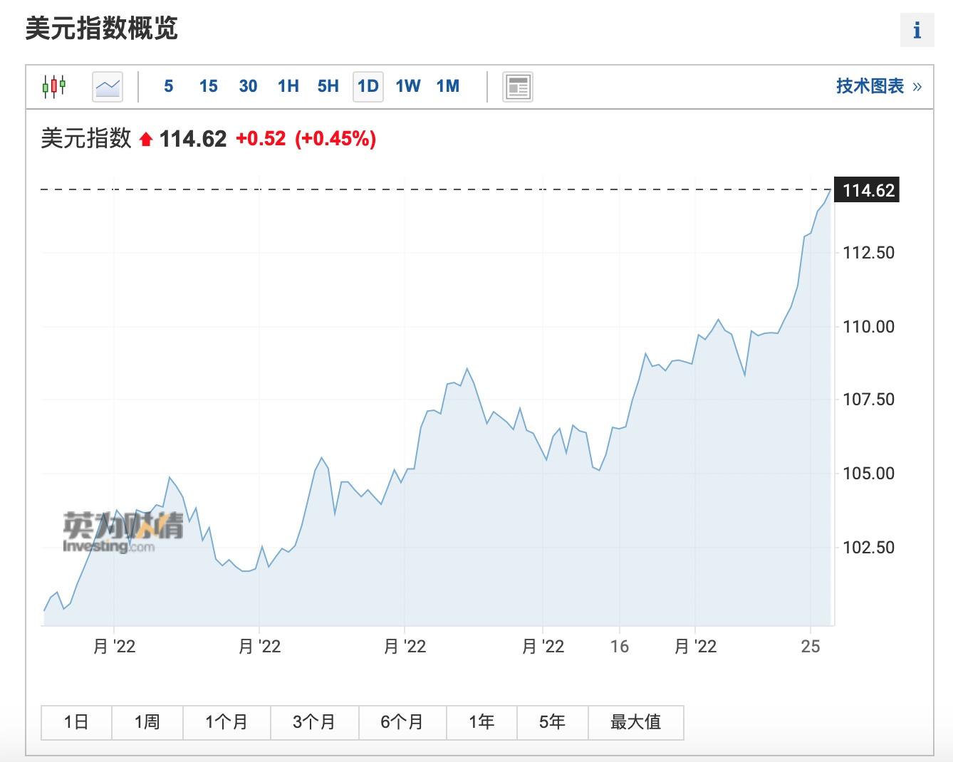 截至发稿,美元指数(DXY)涨0.45%,至114.62,续刷二十年来新高。