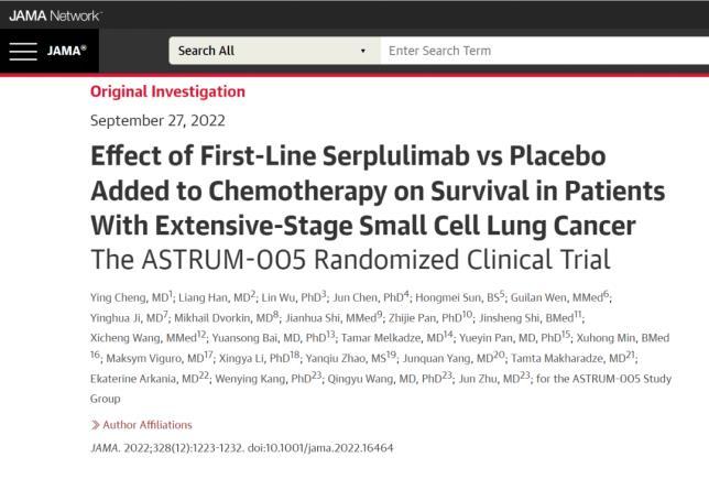 智通财经APP获悉,9月27日,由程颖教授牵头的国际多中心研究——ASTRUM-005研究在全球四大顶级医学期刊之一的《美国医学会杂志》(JAMA,影响因子:157.3)在线发表,成为全球首个登上JAMA主刊的小细胞肺癌免疫治疗临床研究。ASTRUM-005研究是复宏汉霖(02696)自主研发的抗PD-1单抗H药 汉斯状®(斯鲁利单抗)联合化疗一线治疗广泛期小细胞肺癌(ES-SCLC)的Ⅲ期临床研究,2022年ASCO年会程颖教授首次报告结果后,引起了全球同行的广泛关注,而今再度登上国际顶级学术舞台,体现了国际学术界的高度认可,彰显出中国研究者的智慧化和生物医药领域国际一流的自主创新实力和临床运营能力。