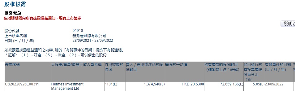 智通财经APP获悉,香港联交所最新资料显示,9月23日,Hermes Investment Management Ltd增持新秀丽(01910)137.4540万股,每股作价20.53港元,总金额约为2821.93万港元。增持后最新持股数目约为7265.91万股,最新持股比例为5.05%。