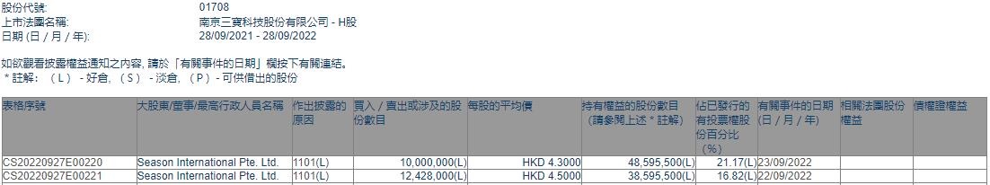 智通财经APP获悉,香港联交所最新资料显示,9月22-23日,Season International Pte. Ltd分别增持三宝科技(01708)1242.8万股、1000万股,每股作价分别为4.5港元、4.3港元,总金额约为9892.6万港元。增持后最新持股数目为4859.55万股,最新持股比例为21.17%。