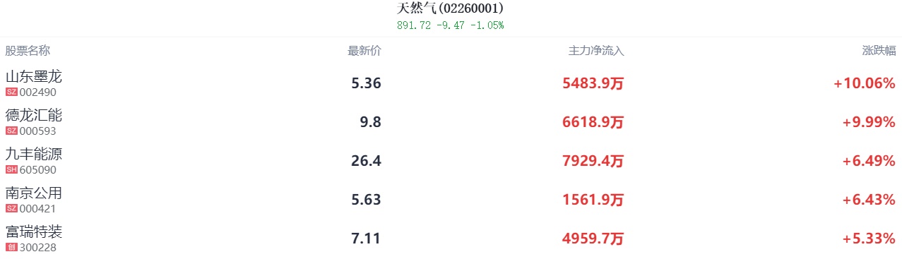 燃气股高开,凯添燃气涨超10%,德龙汇能涨超7%,山东墨龙、九丰能源、首华燃气等走高。